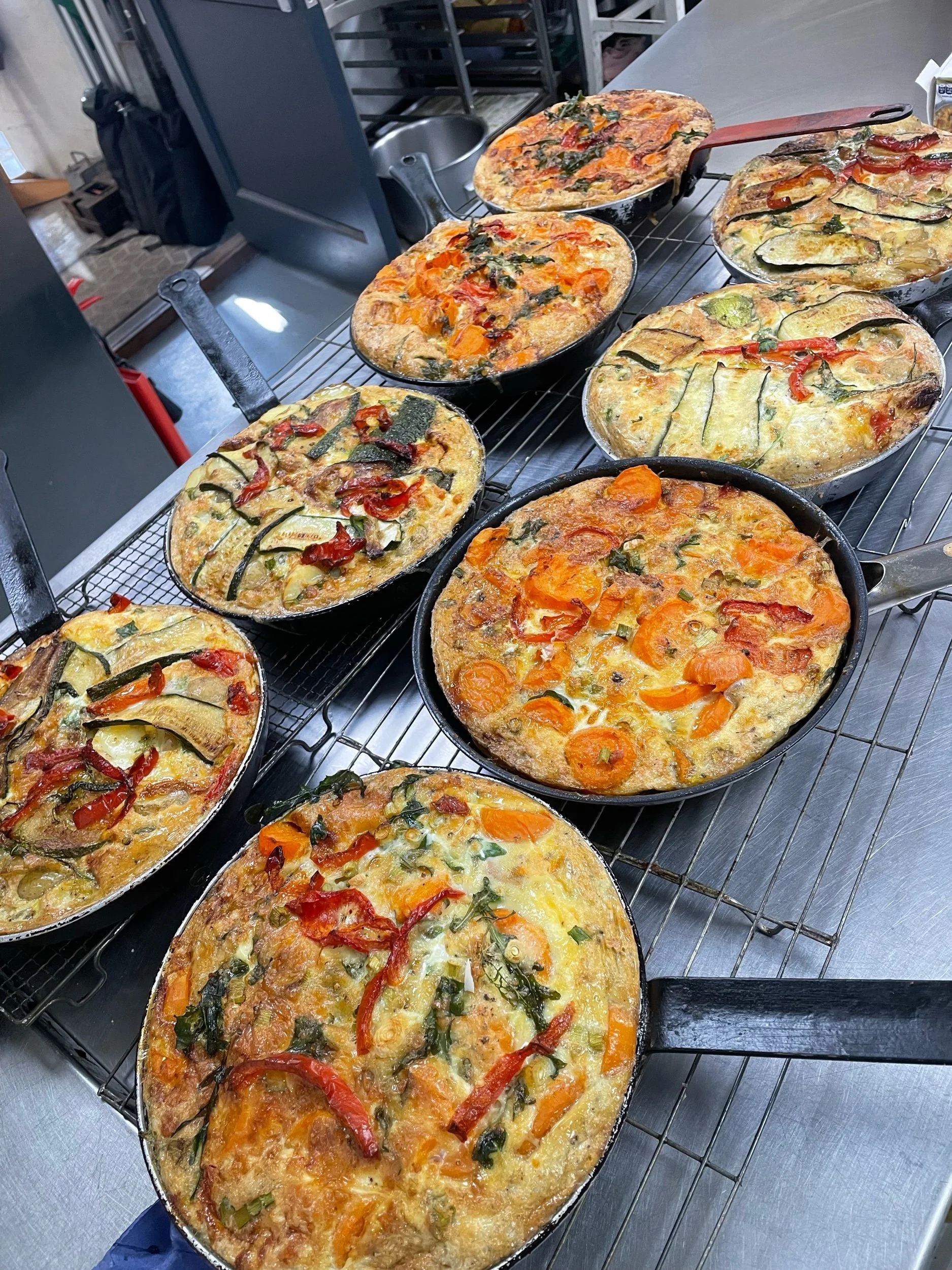 All of our goodies are cooked in our commercial kitchen in Chichester: the tarts and cakes, the brownies and biscuits and the Sussex Cheese Finnies... ah, the finnies! Savouries and sweet, our range includes Arancini and tortilla